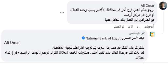 ومن جانبه، رد موظف خدمة عملاء البنك الاهلى المصرى بالصفحة قائلا: "نشكركم على ثقتكم في مصرفنا، سوف يتم توجيه اقتراحكم للجهة المختصة".