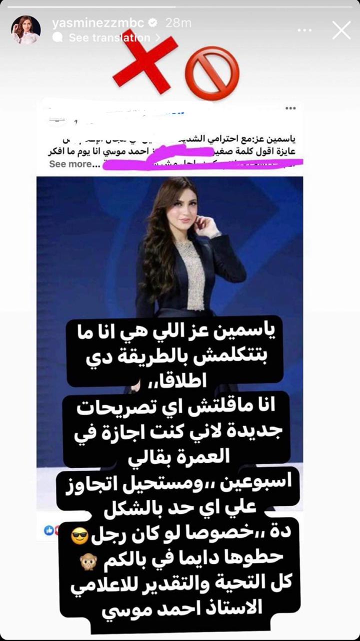 ونشرت ياسمين عز جزء من التصريح المحرف عبر خاصية ستوري بانستجرام، وعلقت: انا مبتكلمش بالطريقة دي إطلاقًا، أنا مقولتش أي تصريحات جديدة لإني كنت أجازة في العمرة بقالي اسبوعين.