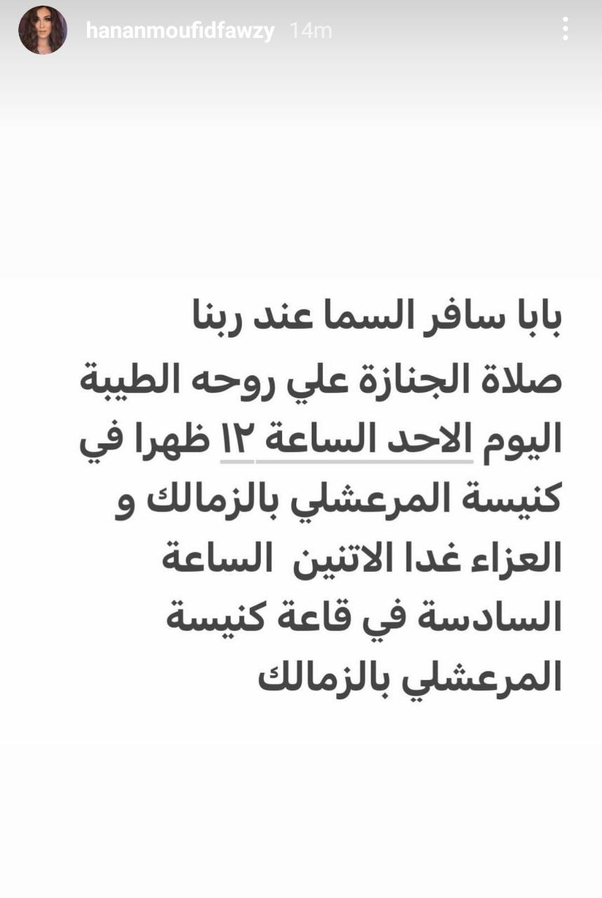 حيث كتبت حنان مفيد فوزي من خلال خاصية “إستوري” عبر حسابها الشخصي على موقع تبادل الصور والفيديوهات “إنستجرام”: “بابا سافر السما عند ربنا.. صلاة الجنازة على روحه الطيبة اليوم الأحد الساعة 12 الظهر في كنيسة المرعشلي بالزمالك والعزاء غدًا الإثنين الساعة السادسة في قاعة كنيسة المرعشلي بالزمالك”.