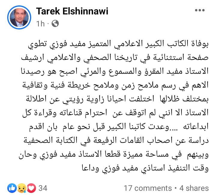 قال طارق الشناوي في منشوره عبر حسابه الرسمي بموقع التواصل الإجتماعي “فيسبوك”: بوفاة الكاتب الكبير الاعلامي المتميز مفيد فوزي تطوي صفحة استثنائية في تاريخنا الصحفي والاعلامي ارشيف الاستاذ مفيد المقرؤ والمسموع والمرئي اصبح هو رصيدنا الاهم في رسم ملامح زمن وملامح خريطة فنية وثقافية بمختلف ظلالها اختلفت احيانا زاوية رؤيتي عن اطلالة الاستاذ الا انني لم اتوقف عن احترام قناعاته وقراءة كل ابداعاته.