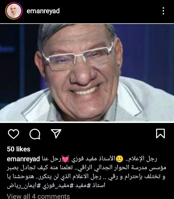 وأعرب ايمان رياض عن حزنها لفراق مفيد فوزي، فكتبت: رجل الإعلام.. الأستاذ مفيد فوزي رحل عنا مؤسس مدرسة الحوار الجدالي الراقي.. تعلمنا منه كيف تجادل بصبر و تختلف بإحترام و رقي .. رجل الاعلام الذي لن يتكرر.. هتوحشنا يا استاذ.