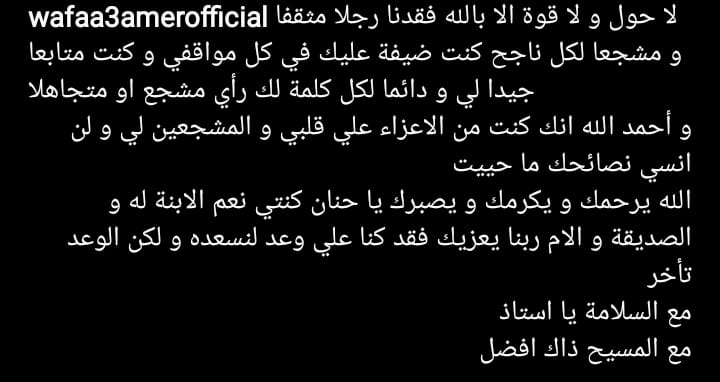 وشاركت وفاء عامر فب دفتر العزاء، فكتب: لا حول و لا قوة الا بالله فقدنا رجلا مثقفا و مشجعا لكل ناجح كنت ضيفة عليك في كل مواقفي و كنت متابعا جيدا لي و دائما لكل كلمة لك رأي مشجع او متجاهلا و أحمد الله انك كنت من الاعزاء علي قلبي و المشجعين لي و لن انسي نصائحك ما حييت الله يرحمك و يكرمك و يصبرك يا حنان كنتي نعم الابنة له و الصديقة و الام ربنا يعزيك فقد كنا علي وعد لنسعده و لكن الوعد تأخر مع السلامة يا استاذ مع المسيح ذاك افضل.