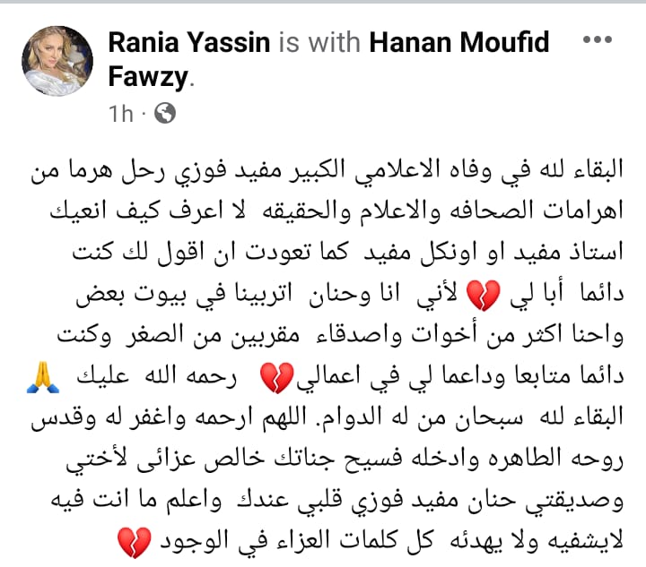 كتبت رانيا محمود ياسين عبر حسابها الرسمي بموقع التواصل الإجتماعي “فيسبوك”: البقاء لله في وفاه الاعلامي الكبير مفيد فوزي رحل هرما من اهرامات الصحافه والاعلام والحقيقه لا اعرف كيف انعيك استاذ مفيد او اونكل مفيد كما تعودت ان اقول لك كنت دائما أبا لي لأني انا وحنان اتربينا في بيوت بعض واحنا اكثر من أخوات واصدقاء مقربين من الصغر وكنت دائما متابعا وداعما لي في اعمالي رحمه الله عليك.