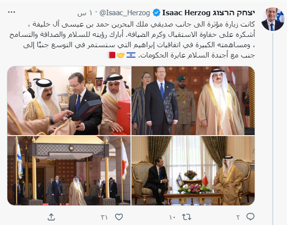 وقال الرئيس الإسرائيلى فى تغريدة له عبر صفحته الرسمية على تويتر:" كانت زيارة مؤثرة الى جانب صديقي ملك البحرين حمد بن عيسى آل خليفة ، أشكره على حفاوة الاستقبال وكرم الضيافة، أبارك رؤيته للسلام والصداقة والتسامح ، ومساهمته الكبيرة في اتفاقيات إبراهيم التي ستستمر في التوسع جنبًا إلى جنب مع أجندة السلام عابرة الحكومات"