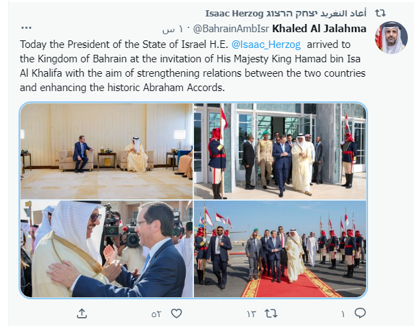 من جهتها، قال سفير البحريني لدى إسرائيل السفير خالد يوسف الجلاهمة فى تغريدة له عبر صفحته الرسمية على تويتر:" وصل رئيس دولة إسرائيل إسحاق هرتسوغ إلى مملكة البحرين بدعوة من الملك حمد بن عيسى الخليفة".