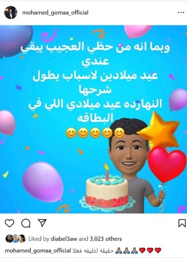 وكتب محمد جمعة عبر انستجرام: وبما إنه حظي العجيب يبقى عندي عيد ميلادين لأسباب يطول شرحها النهارده عيد ميلادي اللي في البطاقة.
