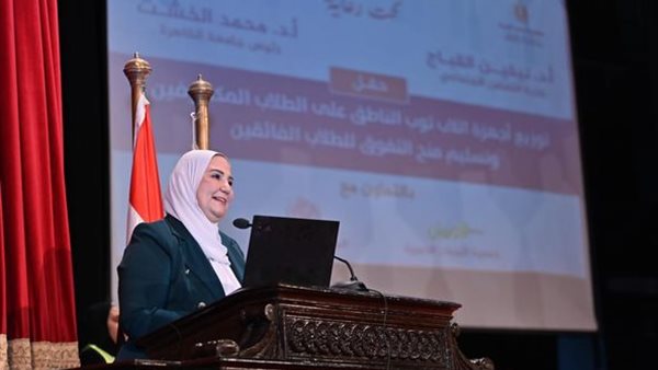وقد وجهت الوزيرة كلمة لشباب الجامعات من الفائقين ومن ذوي الإعاقة ومن الأسر المتواضعة اقتصادياً قائلة: " أرسل لكم تحية حب ومساندة من رحاب جامعة القاهرة العريقة... من تحت القبة التي شهدت تاريخاً مجيداً.. وأقول لكم جميعاً في كل مكان.. اجعلونا نرى حاضراً عنيداً... ومستقبلاً منيراً.. اقووا ولا تهنوا.. واعملوا ولا تيأسوا.. واقتحموا ولا تستلموا.. هكذا أنتم تسعون بالإرادة وتصنعوا مستقبلكم بأيديكم وبجهدكم الدؤوب.. أنتم القلب النابض لبرامج التنمية في مصر.. وقاطرة الوعي والفكر والفعل التي نرتكن إليه في إحداث التغيير الإيجابي الذي نرتأيه، وفي تحقيق النهضة التي بتنا نحلم بها، وفي بناء الوطن الذي ضمنا بين أحضانه ولم يضن علينا بشيء ".