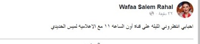 شاركت وفاء سالم فيديو لها عبر حسابها الرسمي بموقع التواصل الإجتماعي “فيسبوك”: بشكركم ان انكم بتطمنوا عليا، وبقولكم ان أنا تمام والحمدلله رب العالمين ده وشي ودي ملامحي، وأكتر حاجة اتبسطت منها في المحنة دي ان حبايبي كتير ودعواتهم ليا كتير تحياتي ليكم.