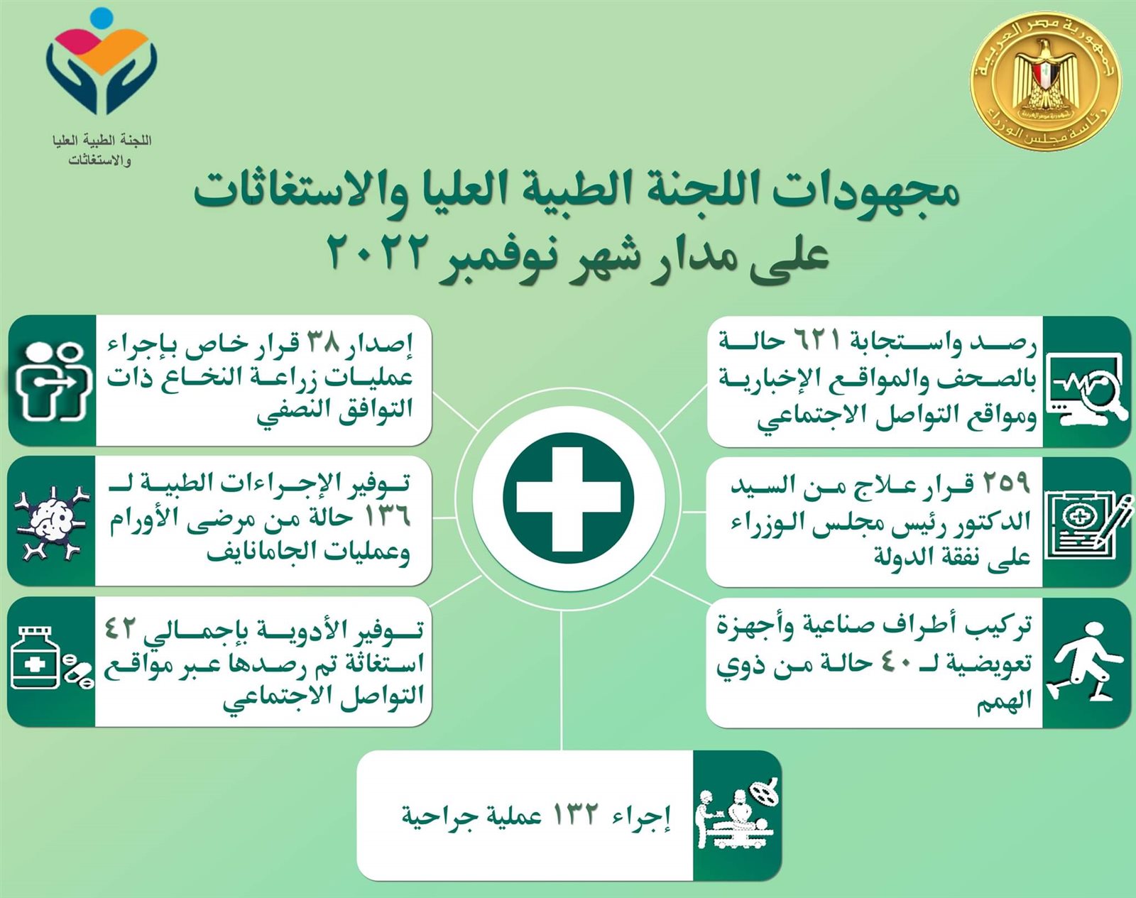 وأشار المستشار الطبي لرئاسة مجلس الوزراء إلى أن الاستجابات خلال الشهر الماضي شملت صدور 259 قرار علاج من رئيس الوزراء على نفقة الدولة، فضلاً عن إجراء 132 عملية جراحية، وإصدار 38 قراراً يخص إجراء عمليات زراعة النخاع ذات التوافق النصفي.