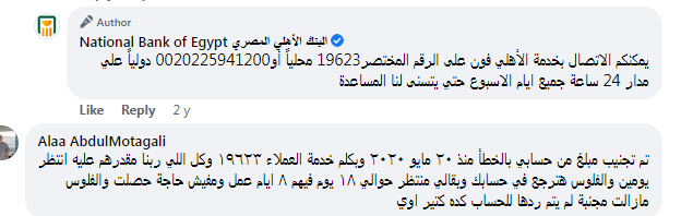 قال أحد عملاء البنك الاهلى المصرى في تعليق عبر صفحة المصرف الرسمي،: "تم تجنيب مبلغ من حسابي بالخطأ منذ ٢٠ مايو ٢٠٢٠ وبكلم خدمة العملاء ١٩٦٢٣ ".