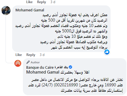 وقال عميل بنك القاهرة في تعليق على صفحة المصرف الرسمية على موقع "فيسبوك"،: "ممكن أعرف يعني إيه عمولة تجاوز أدني رصيد".