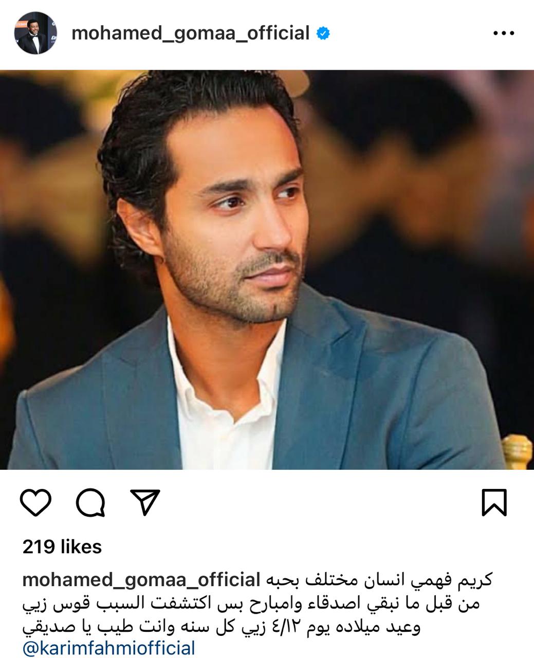 ونشر محمد جمعة صورة لكريم فهمي عبر انستجرام، وعلق: كريم فهمي انسان مختلف، بحبه من قبل ما نبقى أصدقاء وامبارح بس اكتشفت السبب.