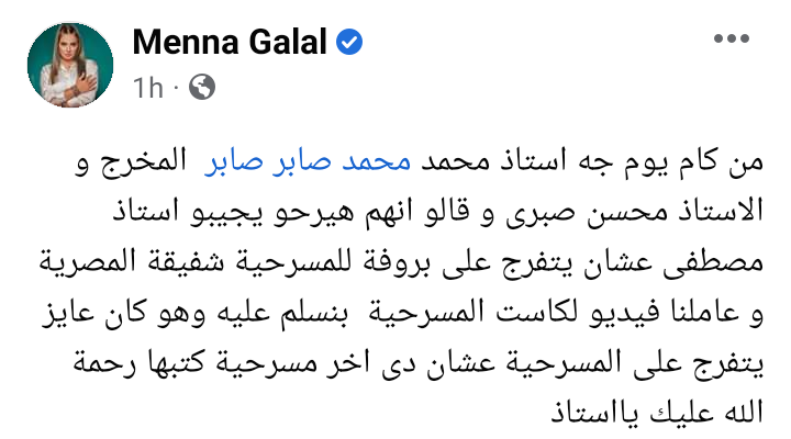 منة جلال تعلن وفاة الكاتب مصطفى سليم: كان نفسه يتفرج على اخر مسرحية كتبها