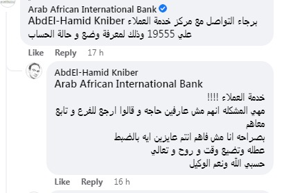 وقال أحد عملاء البنك العربى الافريقى في تعليق على صفحة المصرف الرسمية على موقع: "فيسبوك"، : "خدمة العملاء !!!! ماهي المشكله أنهم مش عارفين حاجة وقالوا ارجع للفرع وتابع معاهم".
