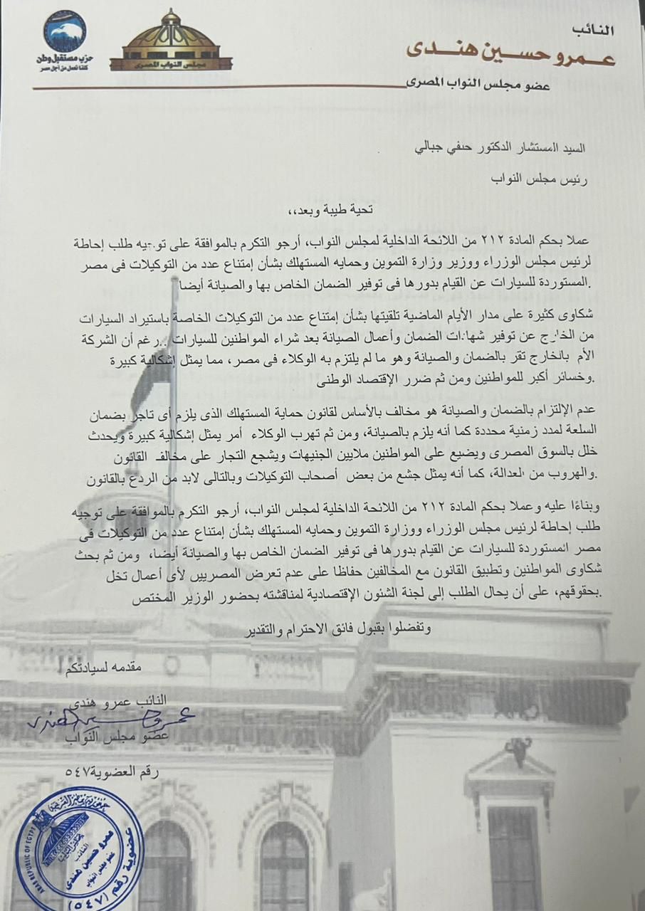 النائب عمرو هندى يتقدم بطلب إحاطة: توكيلات السيارات تمتنع عن تقديم الصيانة للعملاء