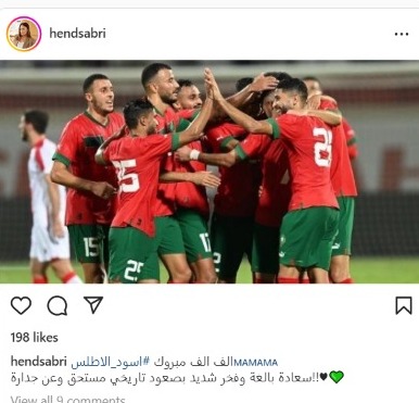 ونشرت هند صبري صورة للفريق المغربي عبر انستجرام، وعلقت: الف الف مبروك اسود الاطلس.. سعادة بالغة وفخر شديد بصعود تاريخي مستحق وعن جدارة!.