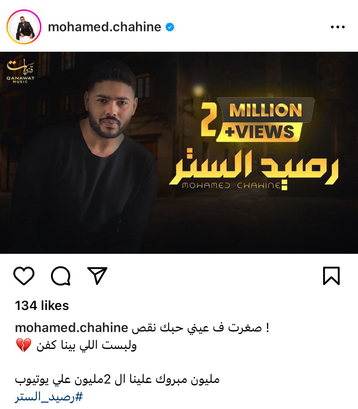ونشر شاهين البوستر المعدل بـ 2 مليون مشاهدة، عبر حسابه بانستجرام، وعلق: صغرت في عيني حبك نقص ولبست اللي بينا كفن.. مليون مبروك علينا الـ 2 مليون على يوتيوب.. رصيد الستر.