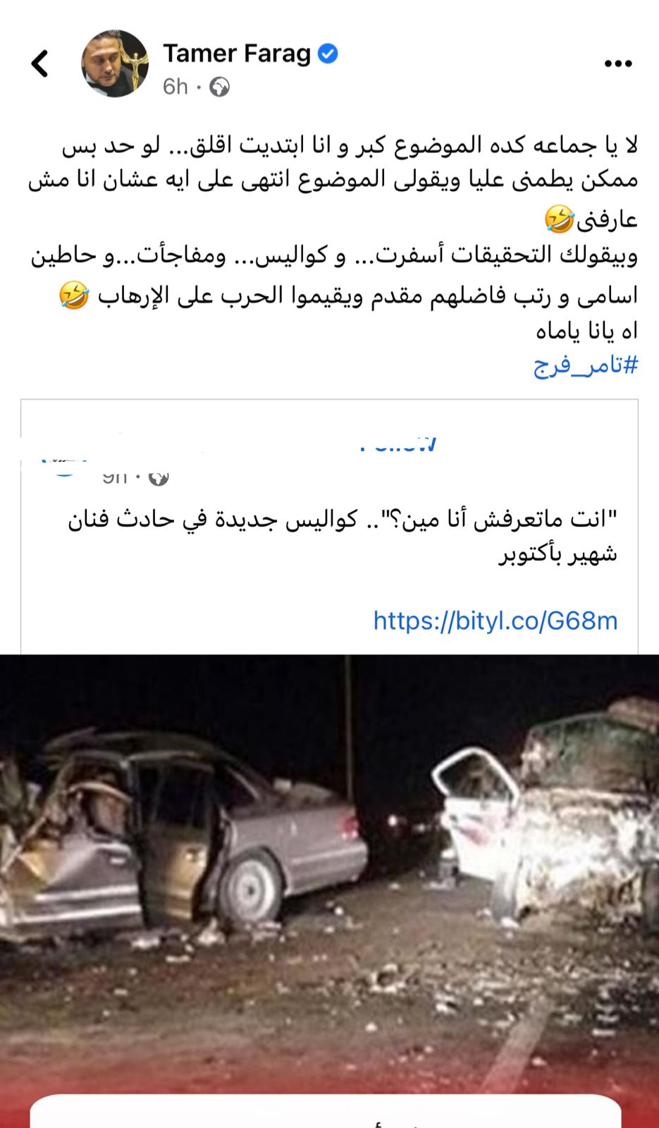 سخر الفنان تامر فرج من الشائعات التي تدور حول تعرضه لحادث سير، وذلك عبر حسابه الرسمي بفيسبوك.