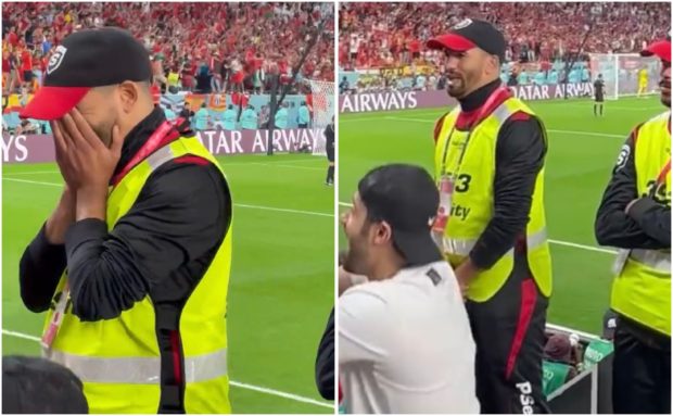 فملعب المدينة التعليمية، كان شاهدًا على واحدة من أصعب اللحظات، فالشاب المغربي، الذي كان يحمي الجمهور، لم يكن لديه رفاهية متابعة ما يدور على أرضية الميدان، لكنه حاول أن يسترق بعض اللحظات، ويتابع ركلة الجزاء الأخيرة التي سددها مواطنه أشرف حكيمي، لينهار بعدها هذا الشاب متأثرًا بهذا الإنجاز التاريخي.
