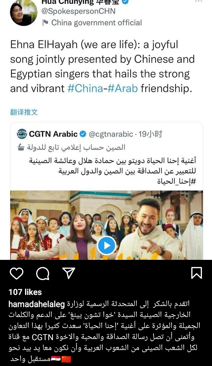 كتب حمادة هلال عبر حسابه الرسمي بموقع تبادل الصور والفيديوهات انستجرام: اتقدم بالشكر إلى المتحدثة الرسمية لوزارة الخارجية الصينية السيدة خوا تشون يينع على الدعم والكلمات الجميلة والمؤثرة أن أغنية احنا الحياة.. سعدت كثيرا بهذا التعاون وأتمنى أن تصل رسالة الصداقة والمحبة والأخوة لكل الشعب الصيني والشعوب الغربية وان نكون معا يد بيد نحو مستقبل واحد.