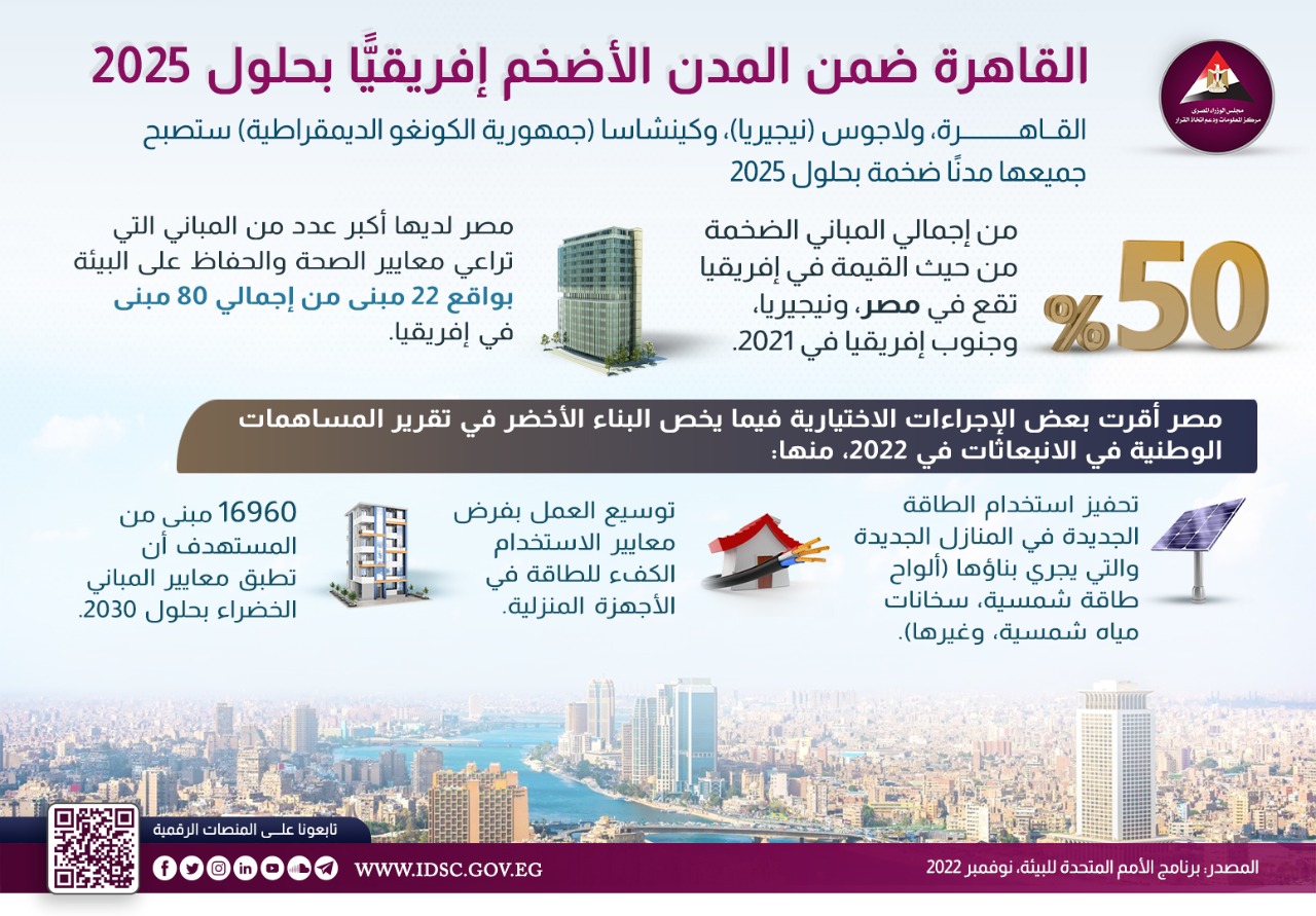 نشر مركز المعلومات ودعم اتخاذ القرار بمجلس الوزراء المصري، إنفوجرافيك جديد بعنوان "القاهرة ضمن المدن الأضخم إفريقيًّا بحلول 2025" يسلط فيه الضوء على أن القارة الإفريقية تشهد نموًا ملحوظًا في عدد سكان الحضر، ومن المتوقع أن يزيد عدد المدن الضخمة في القارة لتصبح القاهرة واحدة منهم، وبالتالي يؤكد الباحثين على أهمية الأخذ في الاعتبار المعايير البيئية الضرورية في عمليات البناء الكبيرة التي تشهدها القارة لضمان نمو مستدام، و صحي، وغير ضار بالبيئة، وتعتبر مصر من أولى الدول الإفريقي اهتمامًا بتلك المعايير.