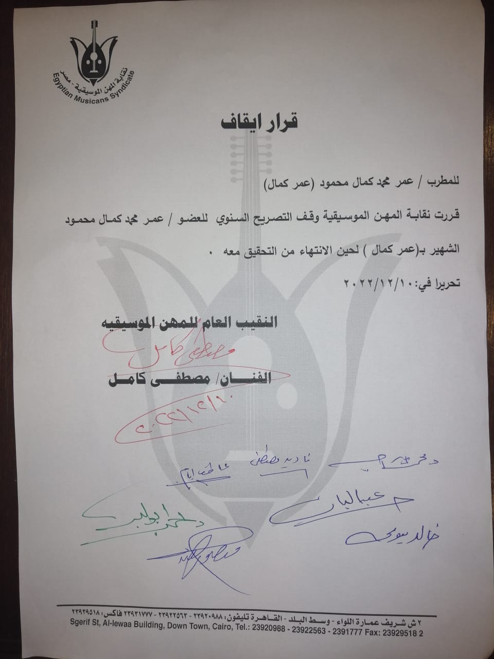 وقالت نقابة المهن الموسيقية في بيان رسمي لها: قرار إيقاف للمطرب عمر محمد كمال محمود ”عمر كمال"، قررت نقابة المهن الموسيقية وقف التصريح السنوي للعضو عمر محمد كمال، لحين التحقيق معه.