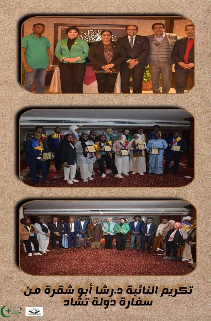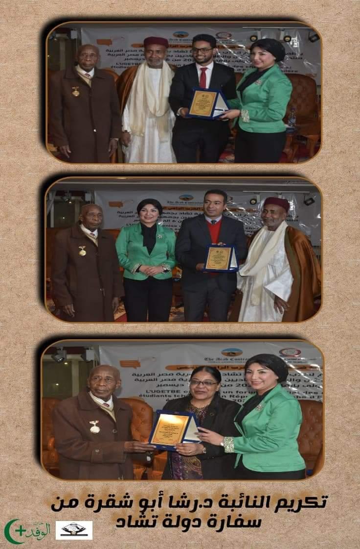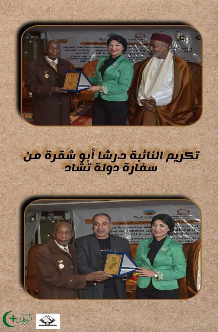 وتم تكريم النائبة رشا أبو شقرة علي مجهوداتها من سفارة دولة تشاد من قبل رئيس الجالية التشادية بالقاهرة، كما شاركت النائبة في تكريم عدد كبير من الباحثين و المتخصصين والمعنيين بالشأن الافريقي.
