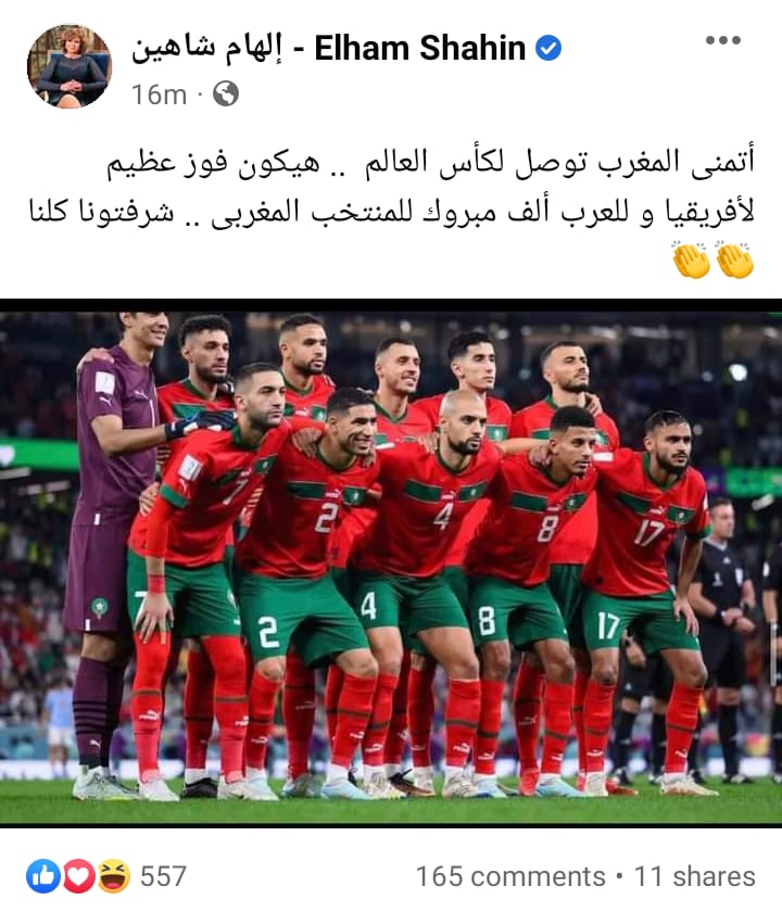 كتبت الهام شاهين عبر حسابها الرسمي بموقع التواصل الإجتماعي “فيسبوك”: أتمنى المغرب توصل لكأس العالم .. هيكون فوز عظيم لأفريقيا و للعرب ألف مبروك للمنتخب المغربى .. شرفتونا كلنا.