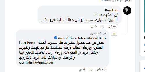 ورد موظف خدمة عملاء البنك العربى الافريقى على الشكوى قائلاً: "نعتذر عن عدم حصول حضرتك على مستوى الخدمة المطلوبة وبرجاء اعطائنا فرصة للمساعدة، نثق في تفهمكم وتقديركم وننتظر مزيد من المعلومات، برجاء ارسال تفاصيل للتحقيق فيها والتواصل مع سيادتكم على البريد الإلكتروني [email protected]".