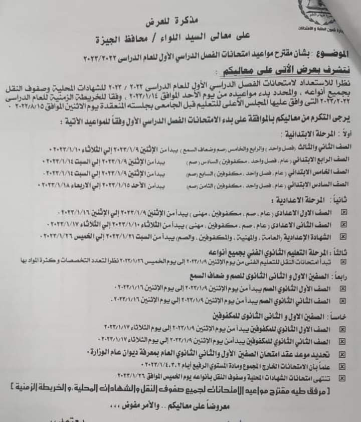 حيث جاء مقترح جدول إجراء امتحانات نصف العام لجميع مراحل النقل بالجيزة والتى جاءت كالتالى: