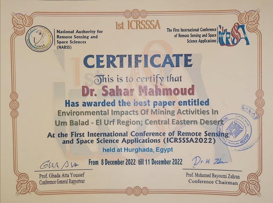 وقد حصلت الدكتورة سحر محمود عبد الباقى أحمد مدرس الجيولوجيا بقسم العلوم البيولوجية والجيولوجيا بكليه التربية جامعه عين شمس على جائزة أفضل بحث بعنوان "التأثيرات البيئية لأنشطة التعدين في منطقة أم بلد العرف وسط الصحراء الشرقية" وتم تكريمها من ا. د. محمد بيومي زهران رئيس الهيئة القومية للاستشعار من البعد وعلوم الفضاء ورئيس المؤتمر وا. د. غاده عطا نائب رئيس الهيئة القومية للاستشعار من البعد وعلوم الفضاء لشئون ريادة الأعمال وخدمة المجتمع ومقرر المؤتمر.