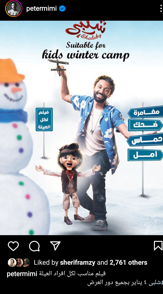 وشارك بيتر ميمي الجمهور بصورة من البوستر الخاص بالعمل عبر حسابه الرسمي بموقع تبادل الصور والفيديوهات انستجرام، وعلق عليها: فيلم مناسب لجميع أفراد العائلة.. شلبي 4 يناير في جميع دور العرض.