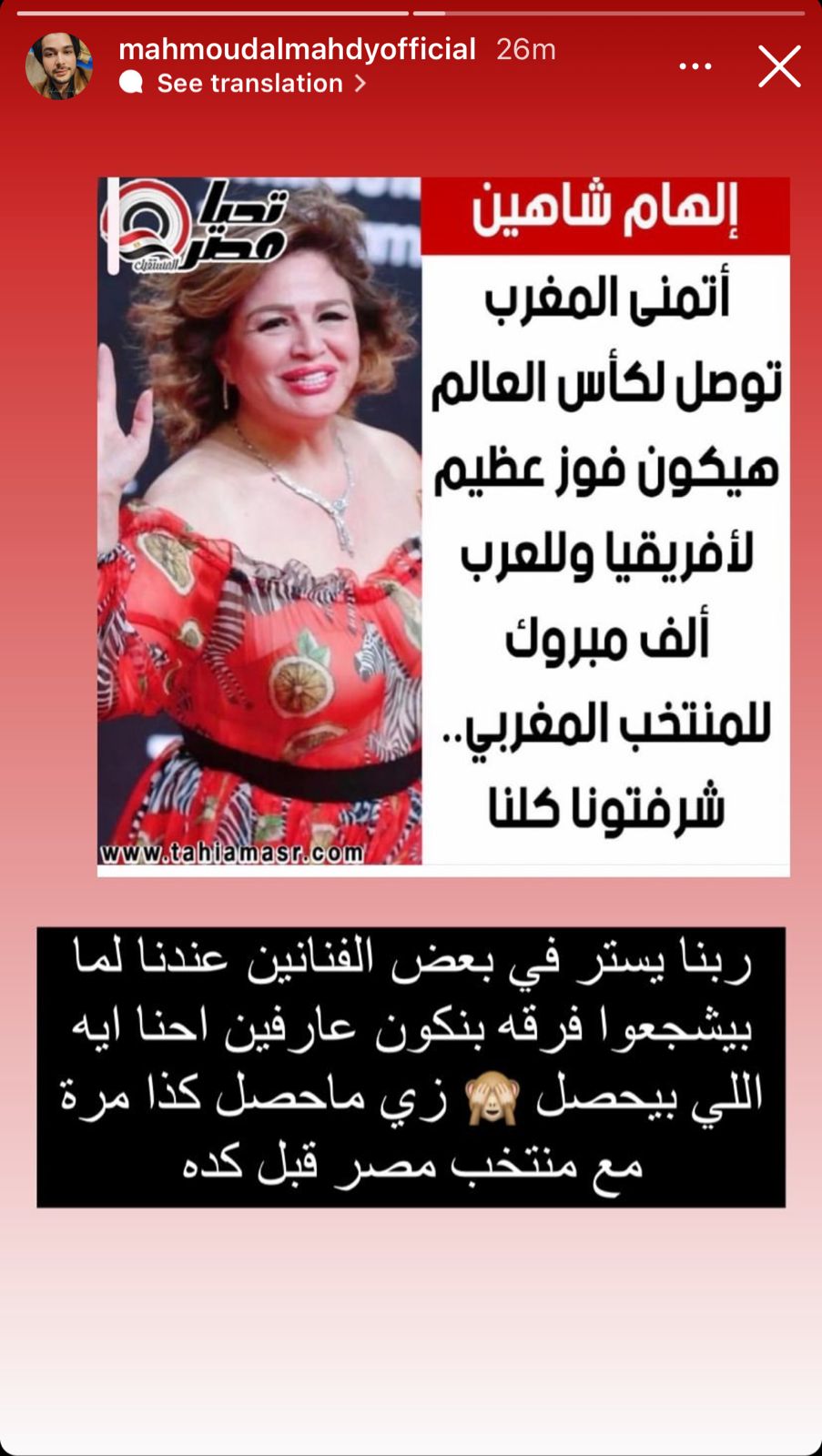 ونشر محمود المهدي بانر لكلمات تشجيع إلهام شاهين للمغرب عبر خاصية ستوري، وعلق: ربنا يستر في بعض الفنانين عندنا لما بيشجعوا فرقة بنكون عارفين احنا ايه اللي بيحصل، زي ما حصل كذا مرة مع منتخب مصر قبل كده.