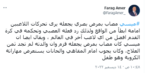 وكتب فرج عامر عبر حسابه الرسمي"فيس بوك:": ميسي مصاب بمرض بصري يجعله يرى تحركات اللاعبين أمامه أبطأ من الواقع ولذلك رد فعله العصبي وتحكمه في كرة القدم افضل من اي لاعب آخر في العالم".