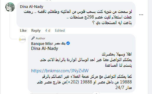 وقال أحد عملاء بنك مصر في تعليق على صفحة المصرف الرسمية على موقع "فيسبوك"،: "لو سمحت من شوية كنت بسحب فلوس من الماكينة وطلعتلي ناقصة.. رجعت عملت استعلام لقيت خصم 298 جنيه مستحقات".