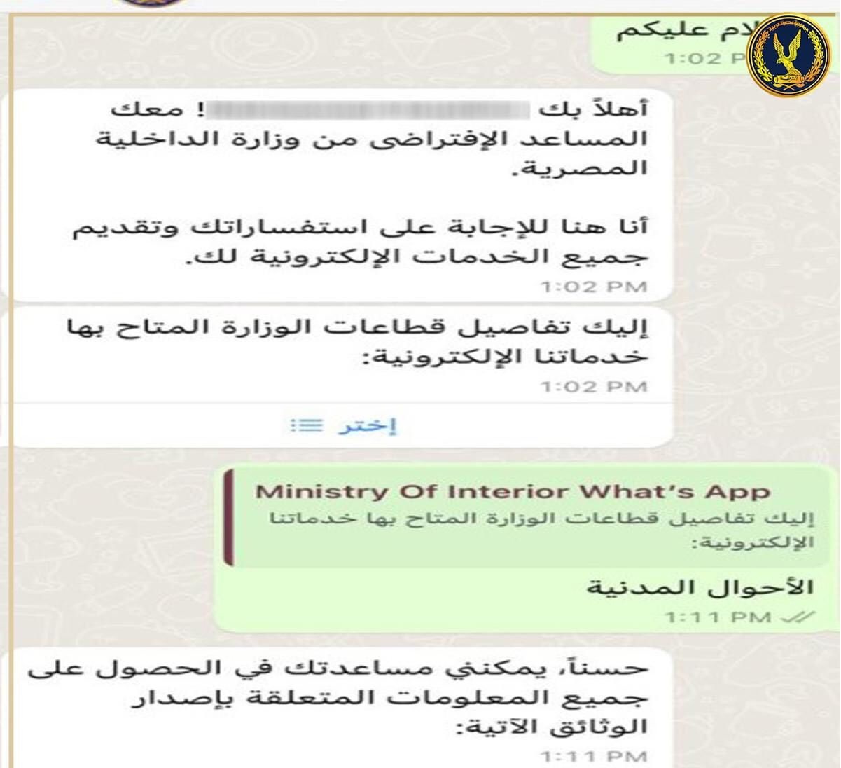وأعلنت الوزارة في بيان لها أن خدمة الرد الآلى تم إطلاقها عبر تطبيق الواتس آب لإتاحة إجابات على أسئلة تتعلق بقطاعات الأحوال المدنية، والجوازات والهجرة والجنسية، والمرور، وتصاريح العمل، والحج، والأدلة الجنائية، الإلتحاق بأكاديمية الشرطة أو معاهد معاونى الأمن، والشقق والمحلات والمزارع المؤجرة وبلاغات مباحث جرائم الحاسبات وشبكة المعلومات، وزيارات نزلاء مراكز الإصلاح والتأهيل، ومجندي وزارة الداخلية.