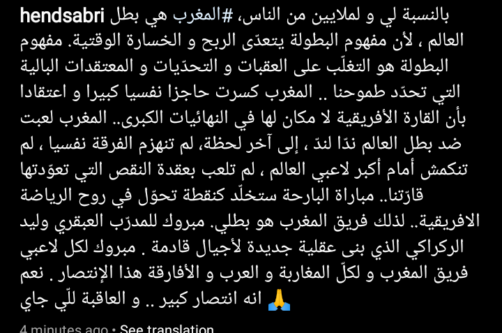 واختتمت: مبروك للمدرّب العبقري وليد الركراكي الذي بنى عقلية جديدة لأجيال قادمة . مبروك لكل لاعبي فريق المغرب و لكلّ المغاربة و العرب و الأفارقة هذا الإنتصار ، نعم انه انتصار كبير .. و العاقبة للّي جاي.