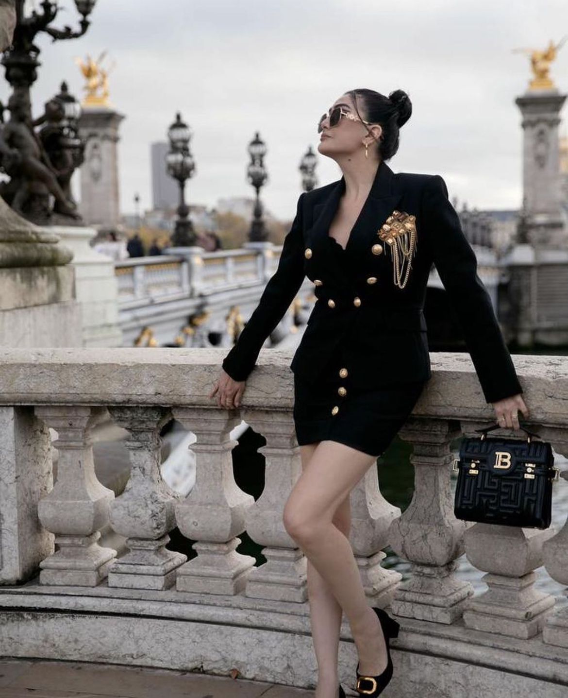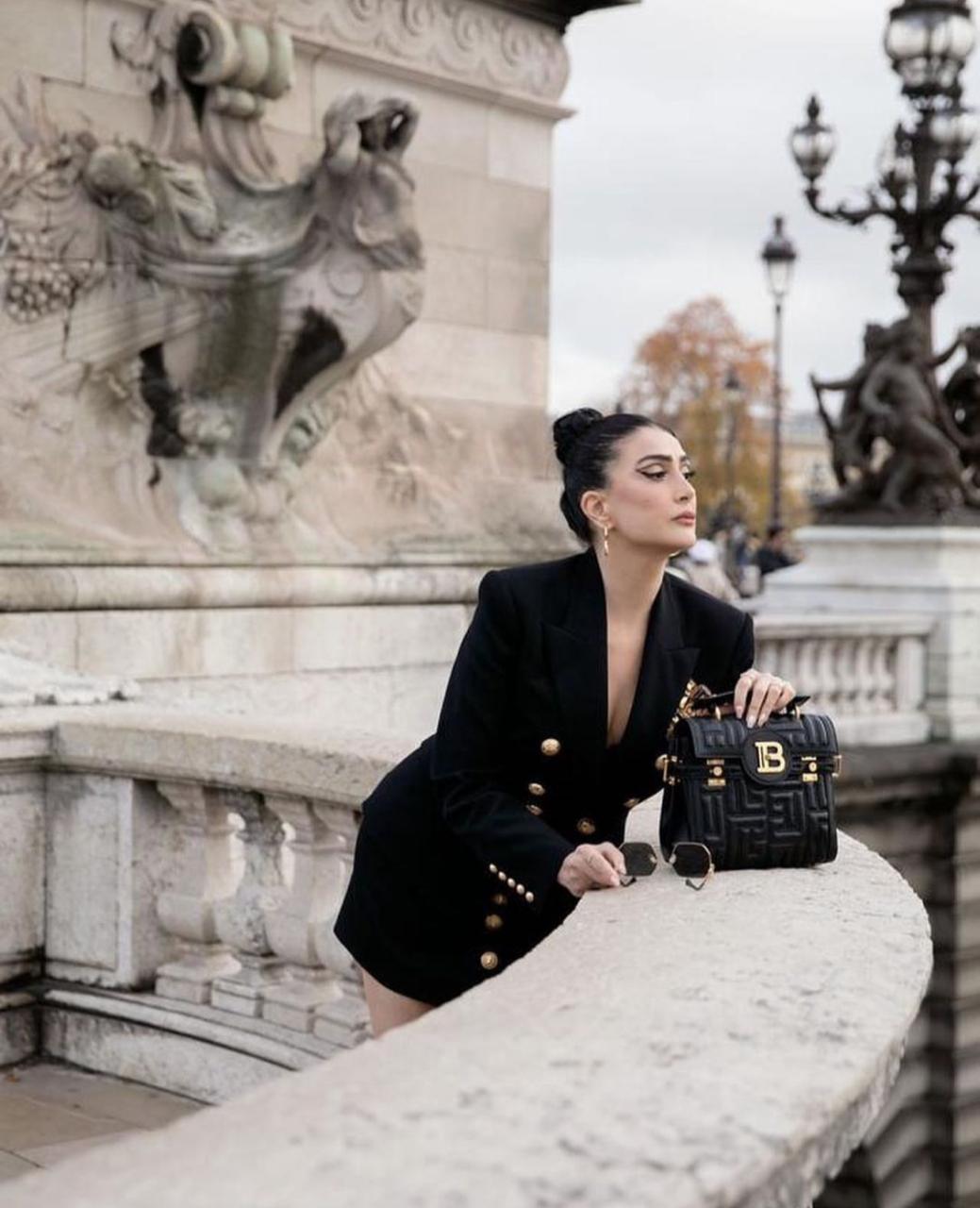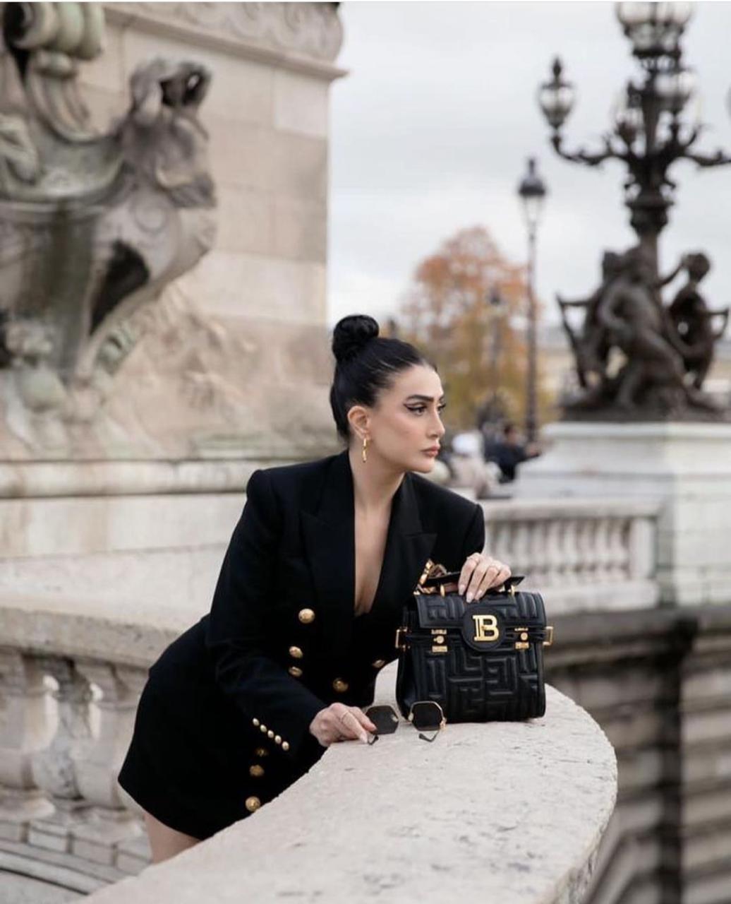 مع هيلز أسود في ذهبي، وشنطة سوداء ونظارة شمسية، ومن الناحية الجمالية اعتمدت مكياج يتناسب مع الإطلالة ويعطي إحساس بالقوة.