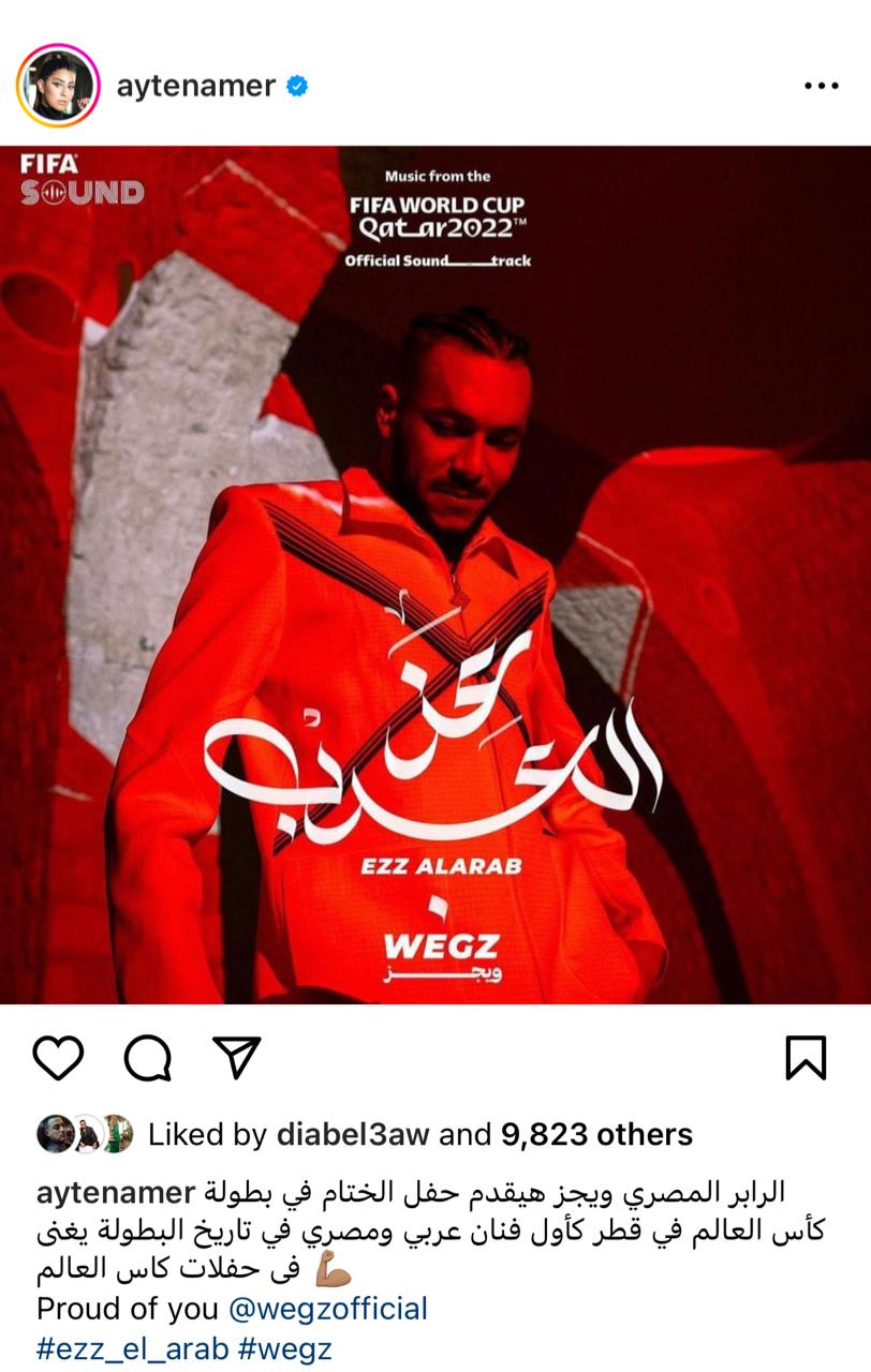 ونشرت آيتن بوستر أغنية عز العرب، وعلقت: الرابر المصري ويجز هيقدم حفل الختام في بطولة كأس العالم في قطر كأول فنان عربي ومصري في تاريخ البطولة يغنى فى حفلات كأس العالم، فخورة بيك يا ويجز.