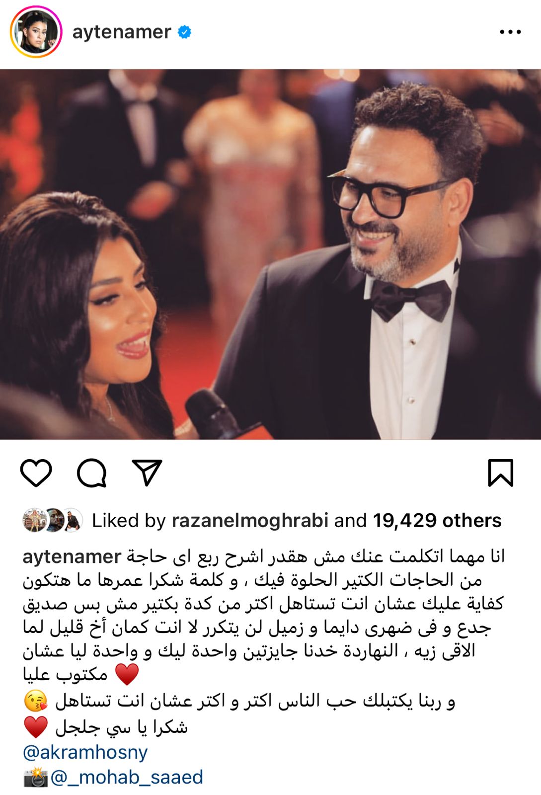 حرصت الفنان آيتن عامر على توجيه رسالة إلى الفنان أكرم حسني وذلك بعد تكريمهم سويًا على مسلسل مكتوب عليا، وذلك عبر حسابها بإنستجرام.