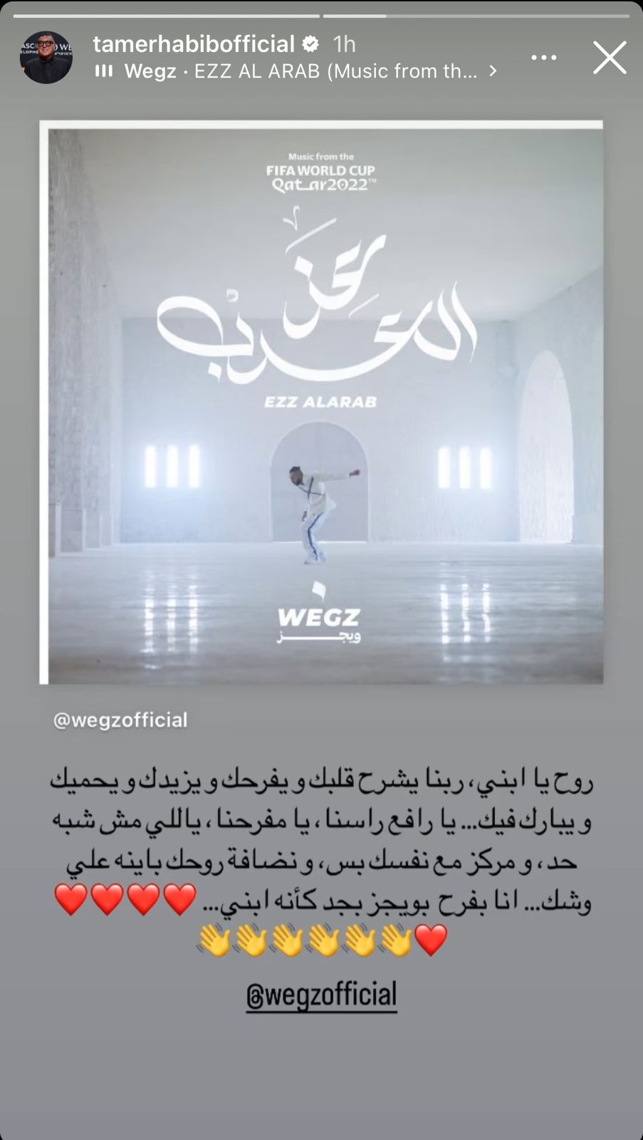 وجه الفنان تامر حبيب رسالة إلى مغني الراب ويجز، وعبر فيها عن فخره واعتزازه به، وذلك عبر حسابه بانستجرام.