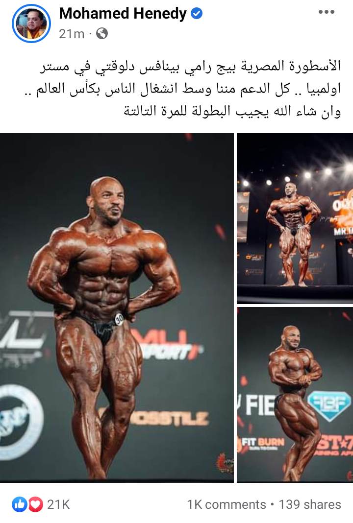 وكتب محمد هنيدي عبر حسابه الرسمي بموقع التواصل الإجتماعي “فيسبوك”، رسالة لـ بيج رامي قال فيها: الأسطورة المصرية بيج رامي بينافس دلوقتي في مستر اولمبيا .. كل الدعم مننا وسط انشغال الناس بكأس العالم .. وان شاء الله يجيب البطولة للمرة التالتة.