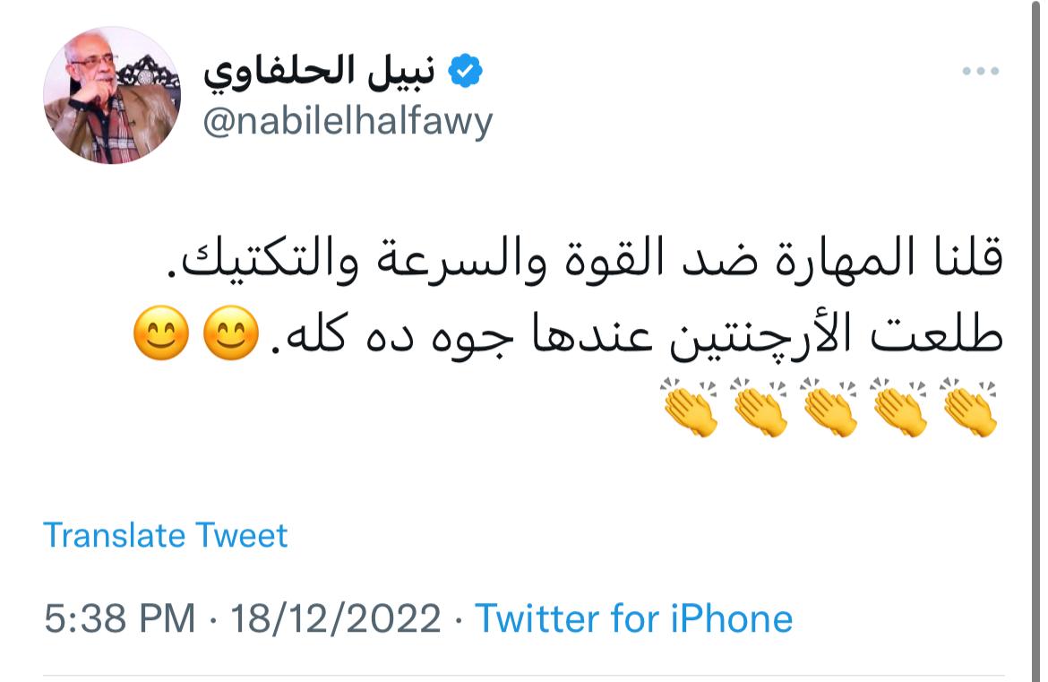 وكتب نبيل الحلفاوي في تويتر: قلنا المهارة ضد القوة والسرعة والتكتيك.. طلعت الأرچنتين عندها جوه ده كله.
