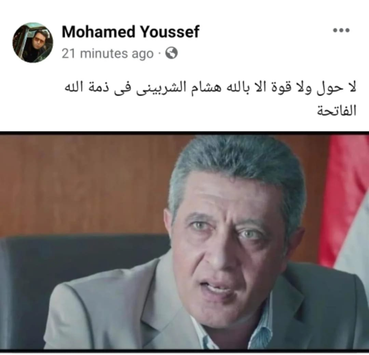 وجاء نبأ وفاة الفنان هشام الشربيني على الصفحة الرسمية للفنان الشاب محمد يوسف، إذ كتب: لا حول ولا قوة الا بالله هشام الشربيني في ذمة الله.. الفاتحة.