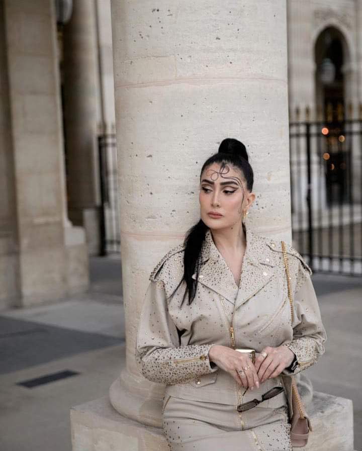 واعتمدت غادة عبد الرازق جيبة قصيرة مع جاكيت بنفس اللون البيج، مع تسريحة شعر ذيل الحصان وخصل من الأمام بطريقة غريبة.
