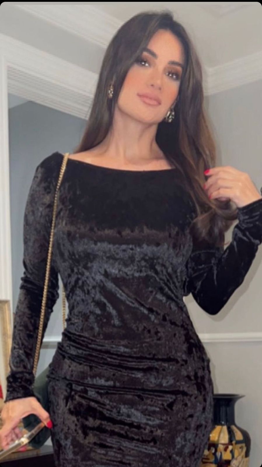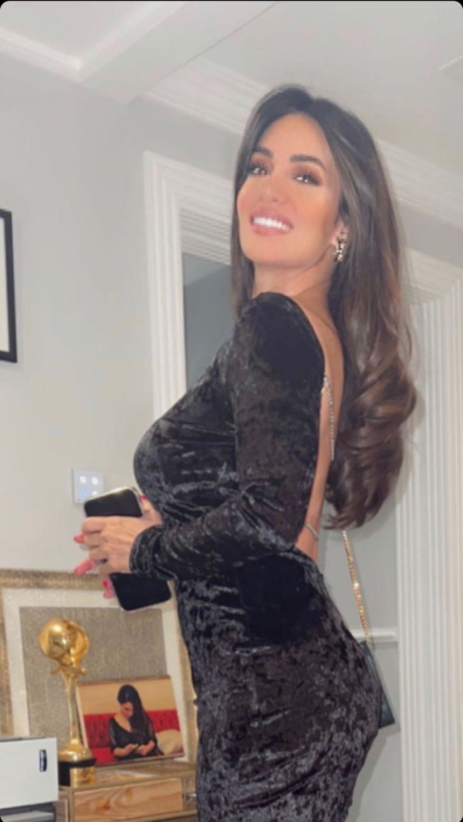 وظهرت حداد بظهر مكشوف، وكانت الإطلالة عبارة عن فستان قصير أسود قطيفة، مع شعر ويفي.