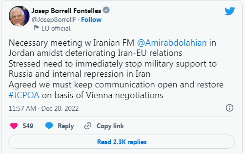 وقال بوريل فى تغريدة له عبر حسابه الرسمي على تويتر:" اجتماع ضروري مع وزير الخارجية الإيراني حسين أمير عبد اللهيان فى الأردن وسط تدهور العلاقات بين إيران والاتحاد الأوروبي".
