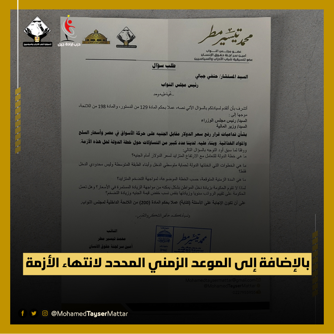 تقدم النائب محمد تيسير مطر عضو مجلس النواب عن تنسيقية شباب الأحزاب والسياسيين، بسؤال برلماني للمستشار الدكتور حنفي جبالي رئيس مجلس النواب، موجه إلى لرئيس الوزراء ووزير المالية، حول خطة الدولة للتعامل مع زيادة الأسعار وارتفاع سعر الدولار أمام الجنيه.