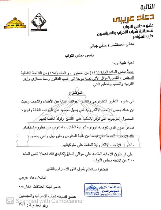 وقالت النائبة دعاء عريبي: في ضوء التطور التكنولوجي وإنتشار الهواتف النقالة بين الأطفال والشباب وحيث أن هناك بعض الألعاب الالكترونية التي يسهل تحميلها علي الهواتف النقالة وأجهزة المحمول الموجوده التي تؤثر بالسلب علي النشئ وتولد العنف لديهم.
