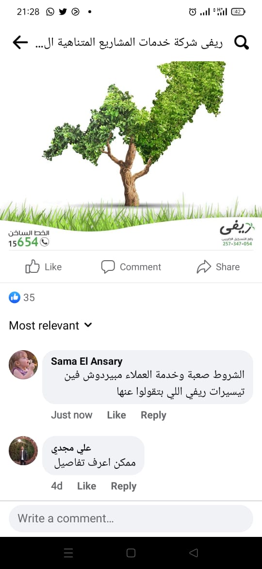 وقالت عميلة شركة ريفى لتمويل المشروعات في تعليق عبر صفحة الشركة،: "الشروط صعبة وخدمة العملاء مبيردوش فين تيسيرات ريفى اللى بتقولوا عنها".